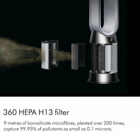 360 HEPA H13 filter: 9 metres of borosilicate microfibres, pleated over 200 times, capture 99.95% of pollutants as small as 0.1 microns.