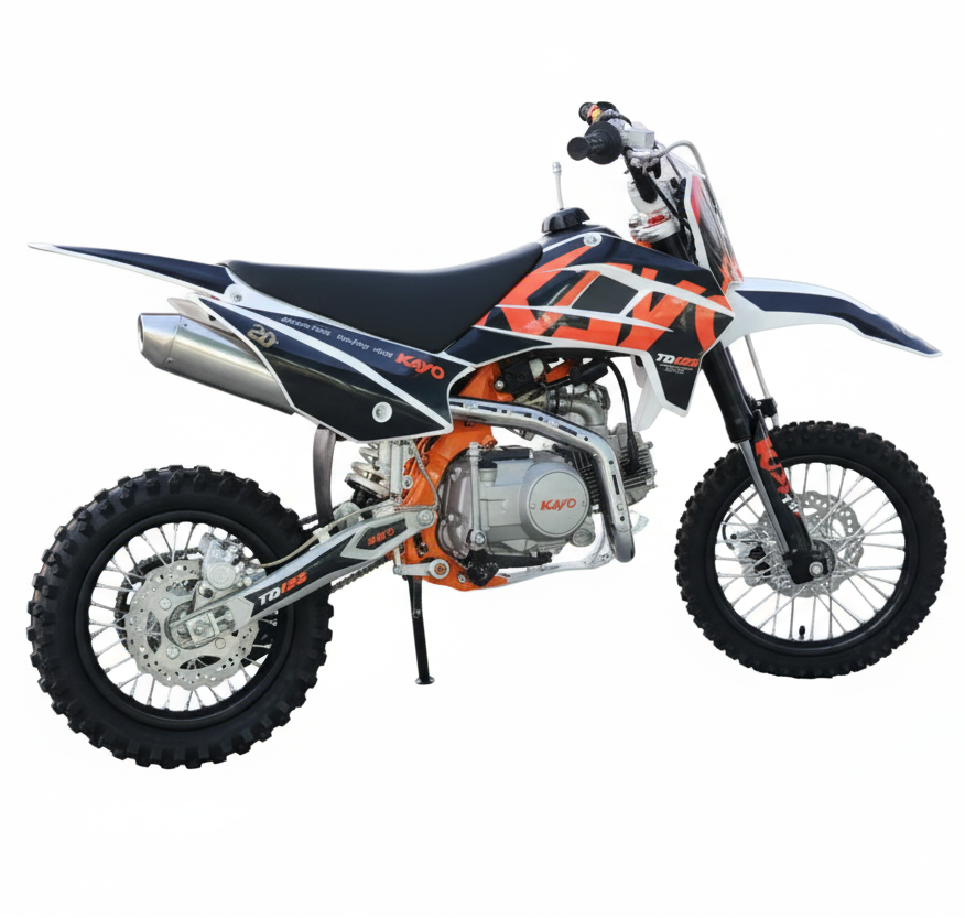 The 2025 Kayo TD 125 is a lightweight, carbureted, air-cooled, 4-stroke dirt bike designed for youth and beginner riders, featuring a semi-automatic 4-speed transmission, electric/kick start, inverted front forks, and dual disc brakes, offering an accessible entry into off-road riding with its manageable 123.7cc engine and agile build.