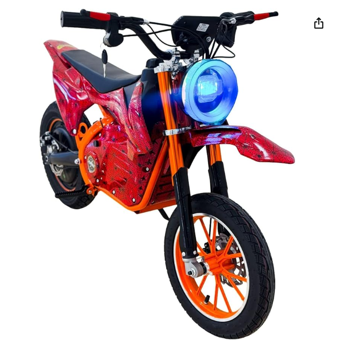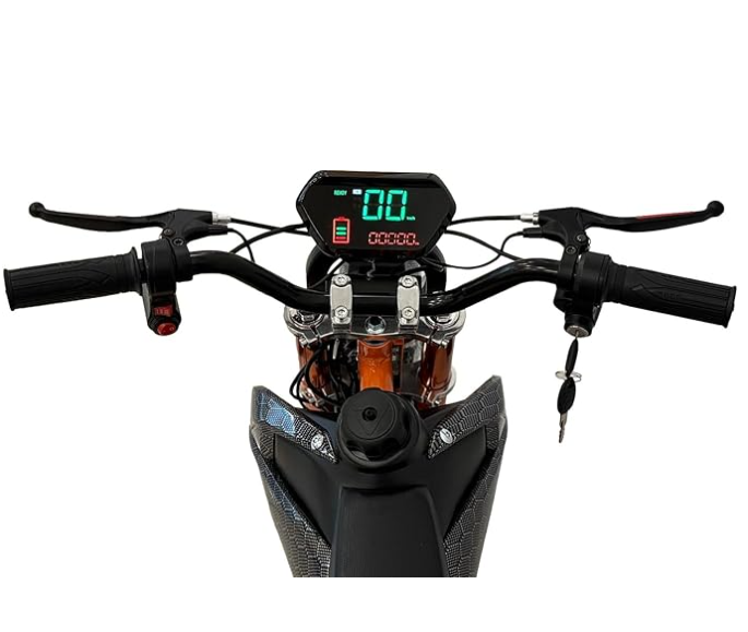 Unleash the excitement of off-road riding with the Black & Orange Kids Electric Dirt Bike, designed for young riders aged 7–12 years. This performance-packed dirt bike combines style, safety, and control for the ultimate junior adventure. Featuring a digital display, riders can easily monitor key stats while enjoying a smooth, stable ride thanks to its advanced shock absorber system and adjustable suspension. The rugged frame, reliable braking system, and bright LED lights ensure both durability and visibility. With up to 60 speed settings, it allows kids to gradually build confidence and master their riding skills. Perfect for young thrill-seekers ready to explore the outdoors with power and precision.