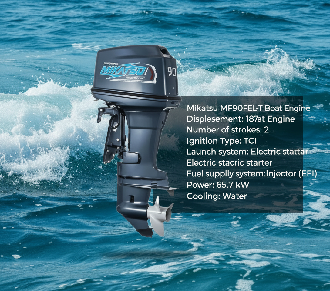 The Mikatsu MF90FEL-T is a powerful 2-stroke, 4-cylinder outboard engine delivering 90 HP for large boats and long-distance adventures. Equipped with premium NGK spark plugs and an advanced fuel system, it ensures smooth, fuel-efficient performance. Water-cooled and built with high-carbon steel components and a protective five-layer coating, it offers durability and corrosion resistance in both fresh and saltwater conditions.