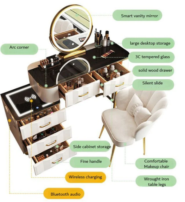 Included Items: 1× Dresser, 1× Makeup Mirror, 1× Chair, 1× Storage Drawer Table with Wireless Charging