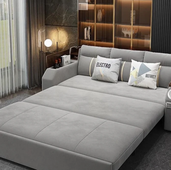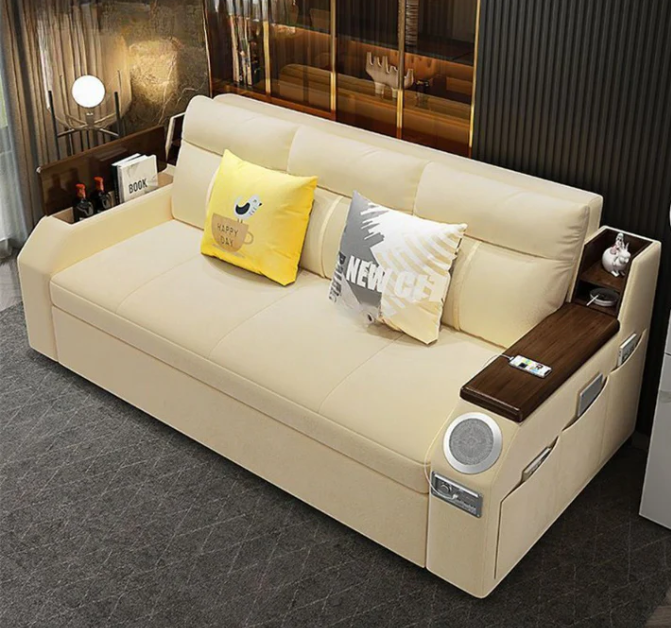 Designed for smart urban living, this modern sofa bed is the perfect all-in-one solution for small apartments and contemporary UAE homes. Seamlessly combining a stylish sofa with a comfortable bed, it maximizes space without compromising on comfort or technology. With built-in Bluetooth speakers, USB charging ports, and hidden storage, this multifunctional piece brings convenience, innovation, and elegance into your living room.