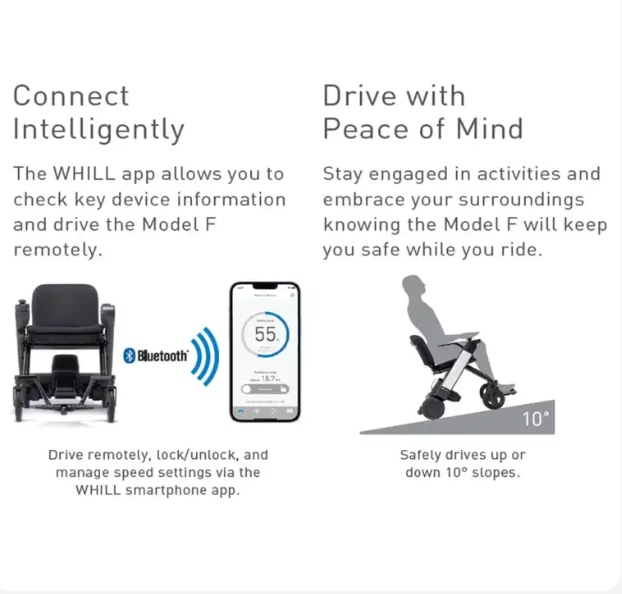 The WHILL Model F is a lightweight, foldable power chair designed for smooth travel and effortless mobility. Built with WHILL’s signature smart technology, it offers excellent performance in a compact, easy-to-handle design. Perfect for navigating UAE malls, airports, parks, hospitals, and residential areas, the Model F delivers comfort, convenience, and reliable portability wherever you go.
