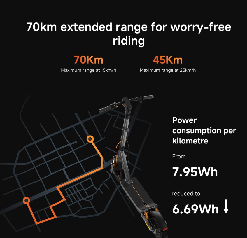5. 70km maximum range at 15km/h: Measured when there is no wind and at 25±2℃, the scooter is fully charged to ride at a constant speed of 15km/h on a mileage test bench until shutdown, with a load of 75kg±0.5kg. TIRT test data, report number: OTSA1-202501046.