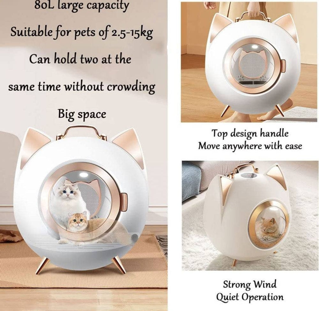 Experience fast, quiet, and gentle pet drying with this upgraded 360° Smart Pet Drying Box. Designed for comfort and convenience, it offers precise temperature control, spacious capacity, and multi-purpose use—perfect for keeping pets warm, calm, and thoroughly dried after every bath.