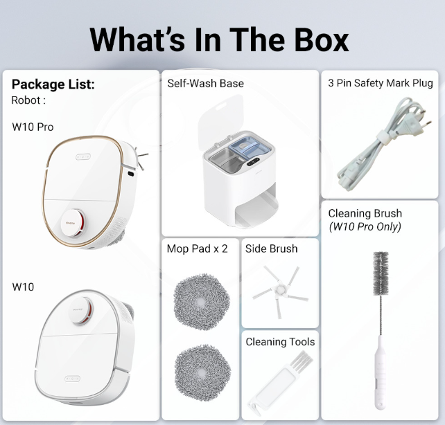 WHAT’S IN THE BOX1 x Robot1 x Self-Wash Base2 x Mop Pad1 x Cleaning Tool1 x Power Cord1 x Side Brush1 x Cleaning Brush (𝗙𝗼𝗿 𝗪𝟭𝟬 𝗣𝗿𝗼 𝗢𝗻𝗹𝘆)