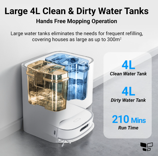 Automatically Cleans the Used MopsAdvance Obstacle Avoidance with AI Action4,000Pa Suction with 19.2cm Ultra-wide Brush4.5L Super-large Clean Water and 4L Waste TankLDS + AI Action Technology