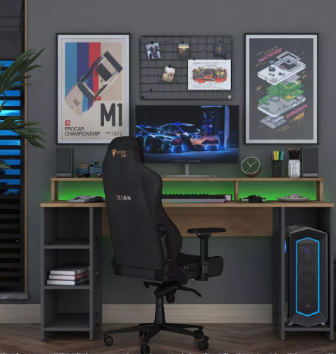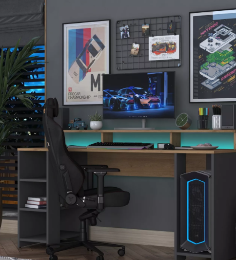 Elevate your gaming setup with this modern Gaming Desk featuring a built-in LED color-changing shelf. Designed for gamers who want style, space, and smart organization, it offers customizable lighting, durable construction, and ample room for all your gear. Perfect for creating an immersive gaming environment at home.