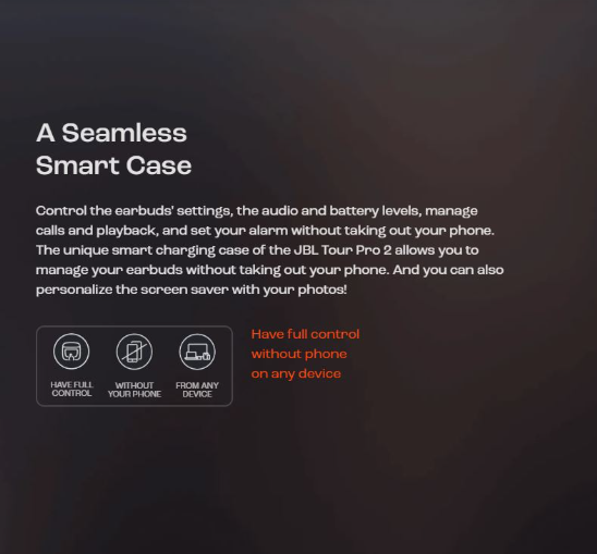 The JBL Tour Pro 2's True Adaptive Noise Cancelling technology tunes out distractions so you can enjoy your favorite audio—or even the sound of silence—all powered by legendary JBL Pro Sound and immerse yourself in superb, spatial audio on the go. The unique smart charging case allows you to direct access all key earbuds features without using the smartphone App. All App features are accessible via the smart case even from non-smartphone devices, such as laptops, PCs, TVs etc. Control key JBL Headphones App features without using your phone, simply touching the charging case screen 1.45”-inch display, for a truly seamless experience. Immerse yourself in spatial audio for up to 40 hours on a single charge thanks to the innovative Bluetooth-enabled smart charging case. The 6-mic technology ensures a superior call quality in any conditions. Turn on the Personal Sound Amplification to boost yours and others' voice volume without ever removing your earbuds.