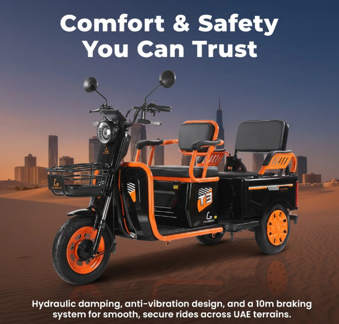 Designed for flexibility, the T3 easily switches between passenger mode and cargo mode with a foldable seat system. Whether carrying a family member, groceries, or small warehouse goods, this electric hybrid tricycle handles it all effortlessly—making it perfect for family use, deliveries, and warehouse operations.
