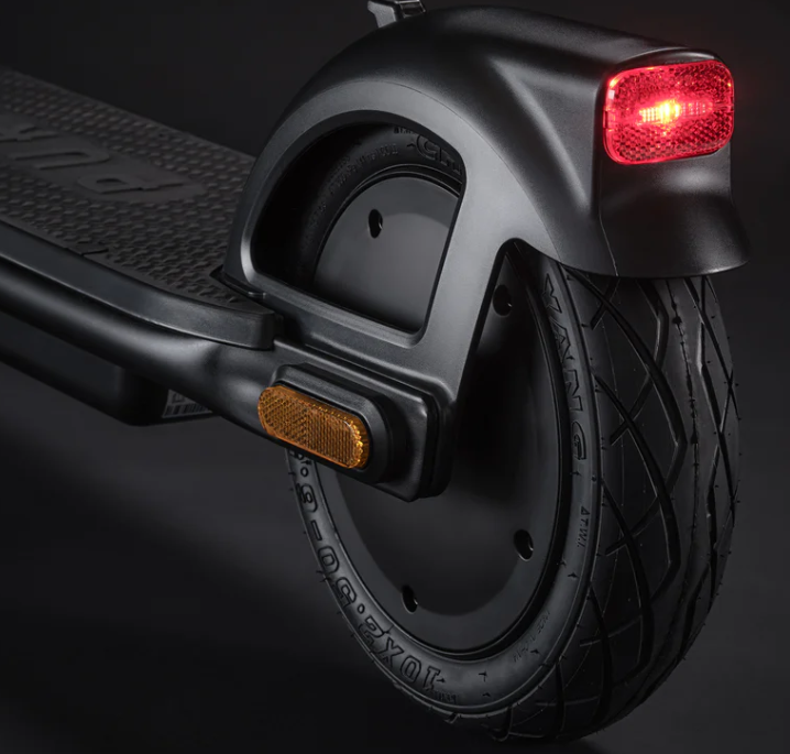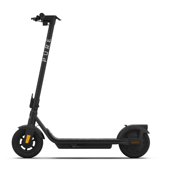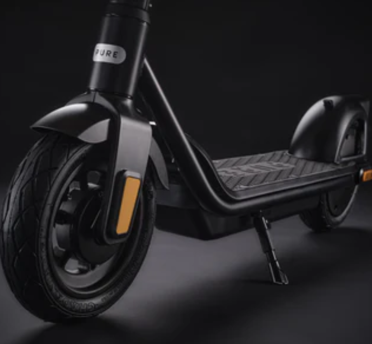 The Pure Air⁴ e-scooter offers solid performance with a 710W peak motor, up to 40 km range, 25 km/h top speed, and IP65 water resistance, featuring 10" tubeless tires, a dual front drum/rear e-brake system, integrated lights, indicators, and app connectivity for control and monitoring, all within a sturdy, foldable frame. Key features include cruise control, three speed modes, and a regenerative braking system for extended battery life, making it a versatile, all-weather option for daily commuting.