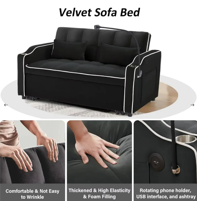 Sleeper Sofa Couch Bed 3 in 1 , Velvet Convertible Loveseat Sleeper Sofa Bed, Pull Out Sofa Bed With USB Port