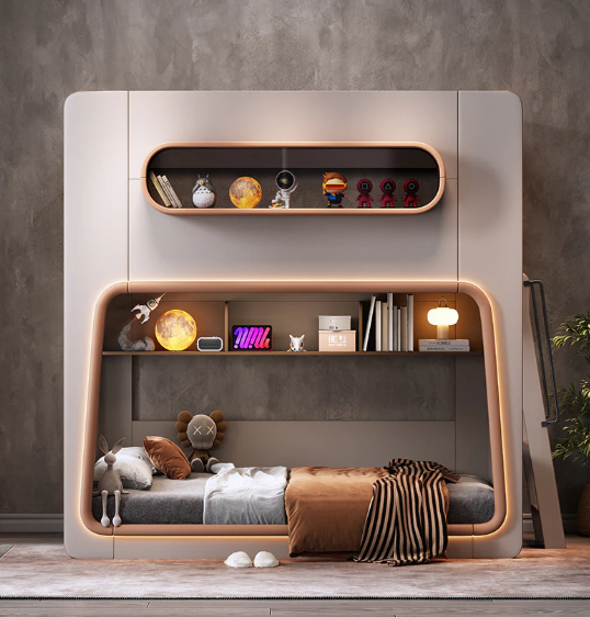 Give your child a cozy, creative, and safe sleeping space with the Space Capsule Double Bunk Bed — designed with premium paint-free eco-friendly boards for durability and peace of mind. Featuring a high guardrail design, rounded corners, and sturdy handrails, it ensures both safety and comfort. The built-in bookshelf and blind box display cabinet encourage organization and imaginative play, while the floor-standing lower bunk provides a spacious, open feel. Perfect for modern kids’ rooms in Dubai and across the UAE.