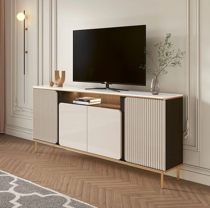 • Ample Storage: Features multiple shelves and compartments for convenient storage of media devices, décor, and accessories.