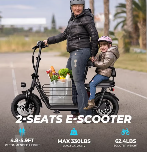 Enjoy a powerful yet comfortable ride with the 500W Electric Scooter – built for speed, stability, and convenience. Powered by a 48V 10Ah battery, it offers up to 40KM range and a thrilling 50KM/H top speed. Its carbon alloy frame, dual suspension, and disc brakes ensure a smooth, safe journey, while 14-inch tires give excellent grip on city roads. With a practical middle basket and dual-seat design, it’s perfect for daily commutes, family shopping trips, or a weekend picnic with your kid. Whether dad, mom, or son is riding, this e-scooter makes urban travel fun, efficient, and effortless.